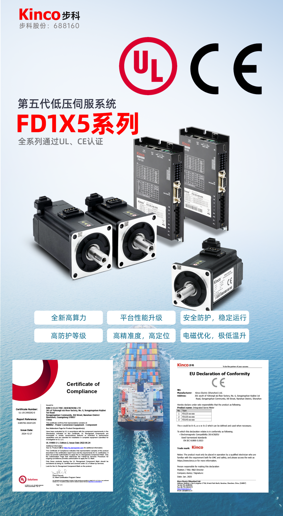 步科FD1X5系列低壓伺服系統憑借著技術創新和可靠品質,全系列通過UL與CE認證,標志著產品在電氣安全、穩定性和環境適應性均達到國際一流水準,助力客戶無縫對接海外嚴苛的法規要求,縮短認證周期,降低市場準入成本。